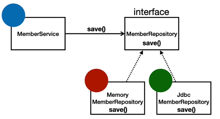 멤버서비스가 save()를 호출을 해서 인터페이스의 멤버리포지토리 세이브를 호출하면 실제 어떤 save()가 호출이 되냐면객체에 메모리 멤버리포지토리가 담겨있으면 메모리 멤버리포지토리 세이브를 호출하고, 만약에 Jdbc 멤버리포지토리가 담겨있으면 Jdbc MemberReposiotory save()를 호출되는 게 오버라이딩