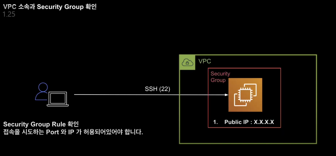- VPC 안에다가 EC2를 생성했다면 (이제는 기본 VPC에 만들게 되어 있음 -> 시큐리티 그룹 반드시 확인!!!)