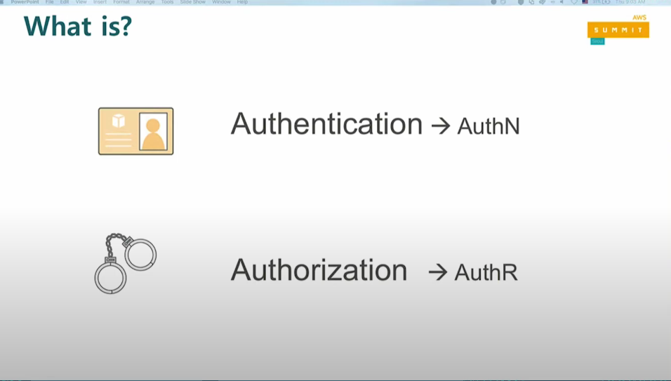 인가(Authoriztion -> AuthR(어떤 일을 할 수 있냐, 권한이 있냐): 단상 위에 올라와서 강연 권한은 없음
